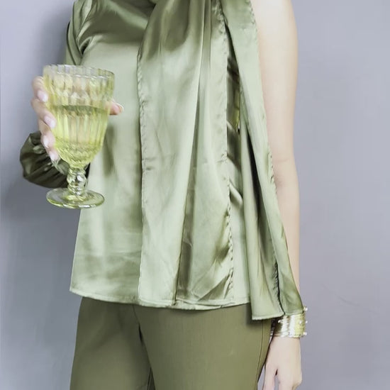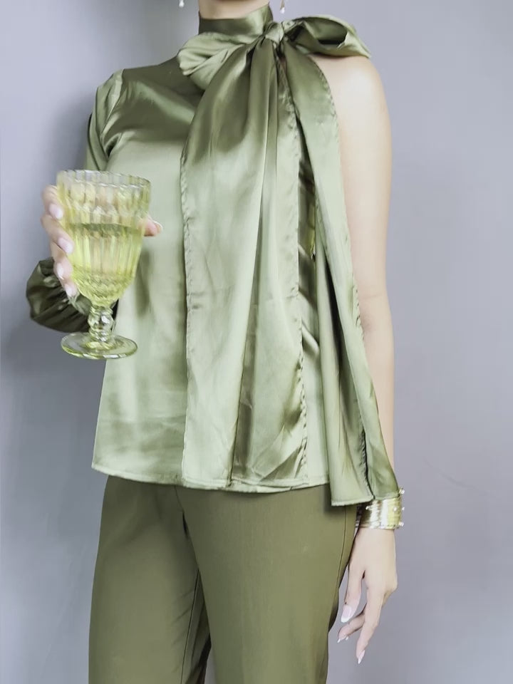 Make a bold yet elegant statement with our one shoulder top, crafted from premium satin fabric that exudes sophistication and effortless style. The smooth emerald green satin offers a subtle luster and fluid drape, ensuring that this piece feels as luxurious as it looks.